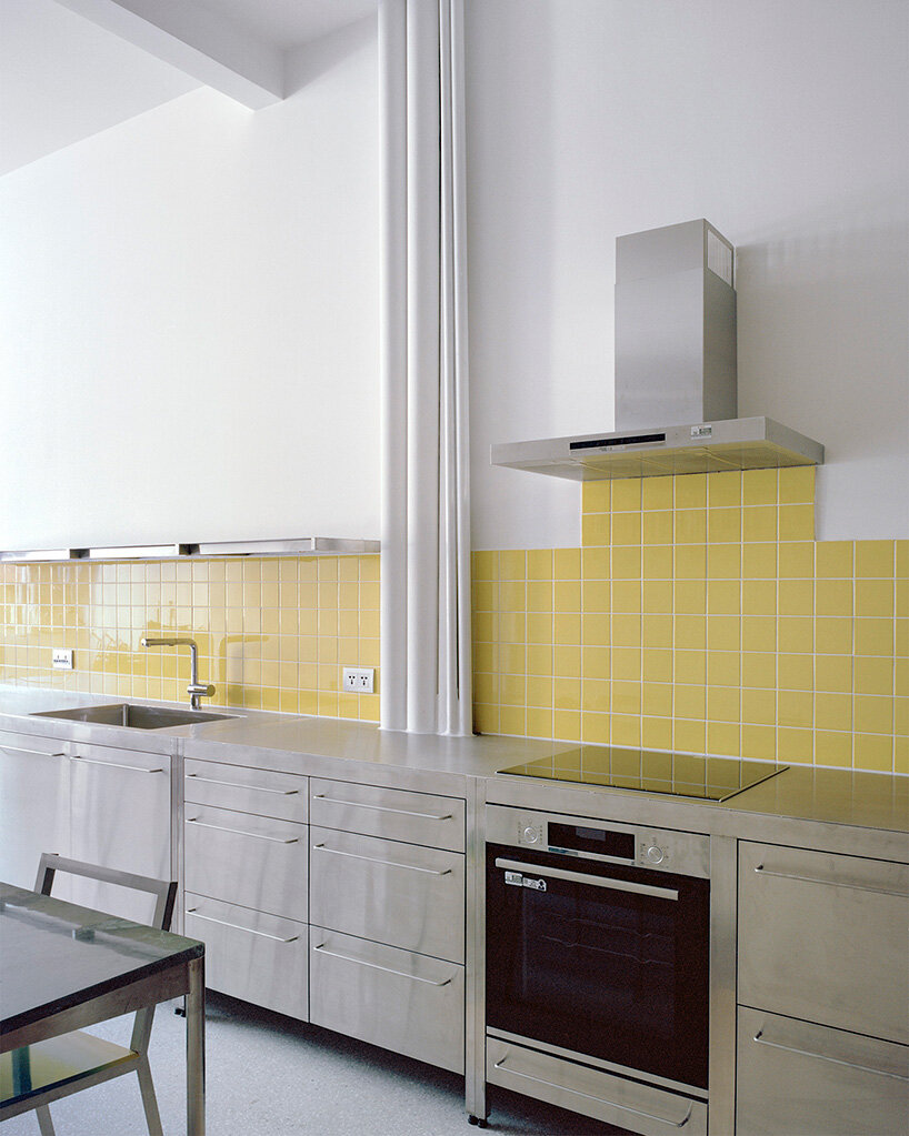 Granito flooring, exposed concrete surfaces, and white-painted walls and ceilings, treated with varying levels of gloss, create a neutral backdrop. Within this restrained field, color operates as punctuation, with bright yellow ceramic tiles, royal blue oil-stained wood cabinetry, and lacquer-red cylindrical handrails animating the interior.