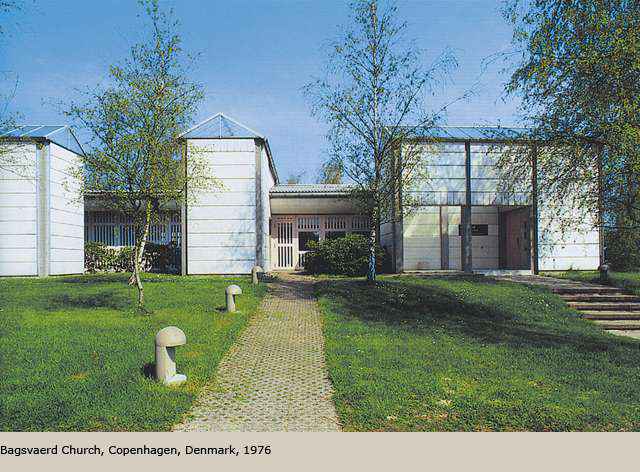 But Jørn Utzon has contributed far more than one masterpiece in his lifetime. As noted architectural author and critic Ada Louise Huxtable points out in her Pritzker Jury comments, “In a forty year practice, each commission displays a continuing development of ideas both subtle and bold, true to the teaching of early pioneers of a ‘new’ architecture, but that cohere in a prescient way, most visible now, to push the boundaries of architecture toward the present. This has produced a range of work from the sculptural abstraction of the Sydney Opera House that foreshadowed the avant garde expression of our time, and is widely considered to be the most notable monument of the 20th century, to handsome, humane housing and a church that remains a masterwork today.” She refers to the Utzon’s church in Bagsværd, a community just north of Copenhagen, where in the 16th century, the King of Denmark allowed an exisiting church to be pulled down to provide bricks for the restoration of a building for the university. The town was without a church building for 400 years, until their pastor happened to see some of Utzon’s work. “At an exhibition of my works, including the Sydney Opera House,” says Utzon, “there was also a drawing of a small church in the centre of a town. Two ministers representing a congregation that had been saving for 25 years to build a new church, saw it and asked me if I would be the architect for their church. There I stood, and was offered the finest task an architect can have—a magnificent time when it was the light from above that showed us the way.” The genesis of the design according to Utzon, went back to a time when he was teaching at the University of Hawaii where he spent time on the beaches. One evening, he was struck by the regular passage of clouds thinking they could be the basis for the ceiling of a church. His early sketches showed groups of people on the beach with clouds overhead. His sketches evolved with the people framed by columns on each side and billowing vaults above, and moving toward a cross. It’s not surprising that the end result provoked this comment from another Pritzker Juror, Carlos Jimenez who is an architect and teacher himself: “…each work startles with with its irrepressible creativity. How else to explain the lineage binding those indelible ceramic sails on the Tasmanian Sea, the fertile optimism of the housing at Fredensborg, or those sublime undulations of the ceilings at Bagsværd, to name just three of Utzon’s timeless works.” Both jurors Jimenez and Huxtable singled out “housing” in their comments. There are two courtyardstyle housing estates in Denmark designed by Jørn Utzon: the Kingo Houses in Helsingør and the houses in Fredensborg. His interest in courtyard-style housing was first shown in a competition for Skåne, Sweden in 1953. He based his designs on his own experiences. His family home in Ålborg had a nursery garden in front. The neighbors all had huts, sheds or some kind of shelters for a variety of activities—raising rabbits, boat-building, or simply storing items for family activities. Traditional Danish farmhouses had four sheltering sections set around a central courtyard. Further, Utzon had studied Chinese architecture which described their farm houses as being completely closed to the outside, but opening onto a central court. And he learned of a Turkish building regulation that allowed no one to block the view of existing houses. Designing with these tenets in mind, he won the Swedish competition, but the project was never realized. Not long after that, he took his Swedish plans to the Mayor of Helsingør along with a study he had done on a poorly designed and executed housing development that had been built in Denmark. He was able to convince the Mayor that he could provide his Swedish design for the same cost as the poorly done one. The Mayor put a tract of nine acres of land with a pond and rolling hills at his disposal for his housing plan. Utzon commissioned a show house from a firm of builders. The house was a success and eventually 63 houses were built within cost restrictions set up by the government to keep the costs below a certain level for low income workers. The 63 houses were built in rows following the undulations of the site, providing a specific view for each house, as well as the best situation possible for sunlight and shelter from the wind. Utzon likes to describe the arrangement of the houses as “like flowers on the branch of cherry tree, each turning toward the sun.” The individual houses are L-shaped with a living room and study in one section, and the kitchen, bedroom and bathroom in the other. Walls of varying heights closed the remaining open sides of the L. The success of these houses at Helsingør led to another for the Dansk Samvirke, a support organization for Danish citizens who have worked for long periods abroad in business or the Foreign Service. They wanted a development for retirees who had returned to Denmark and could live in a community and share their experiences. Utzon accepted the task of conceiving the program and designing the houses, even though no site had been found, and without fee if the project was not built. He helped find the site in Fredensborg, North Zealand, and developed a plan that allowed each house to have a view of and direct access to a green slope. Since there was no comparable society as this anywhere, Utzon had to invent the details of the project and make them conform to his idea for the individual houses. One of the things the committee wanted was a centre where the residents could meet, along with a dining room and kitchen, a communal lounge and party area. Some office space was needed as well as several guest rooms for the residents’ guests, which in effect became a small hotel. In the end, the Fredensborg development was designed with 47 courtyard and 30 terraced houses. The terraced houses were grouped ar